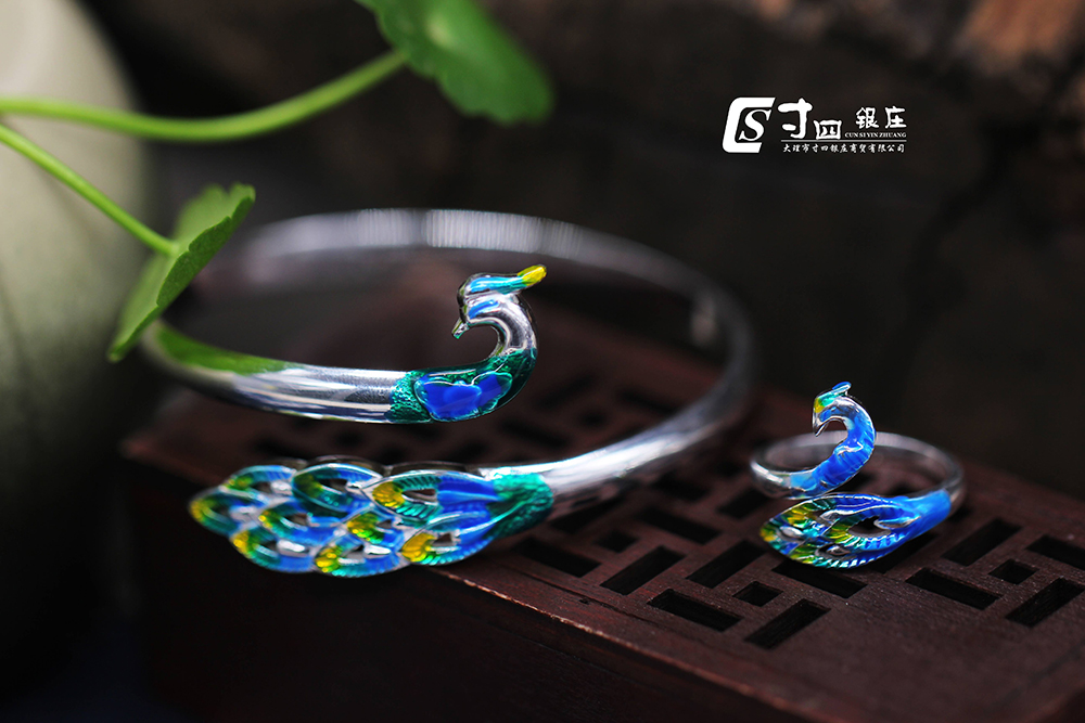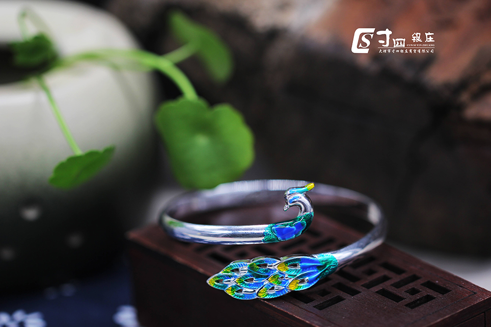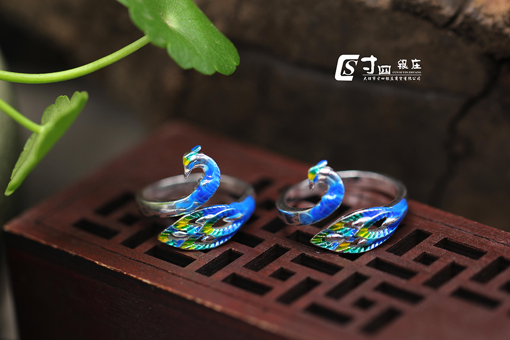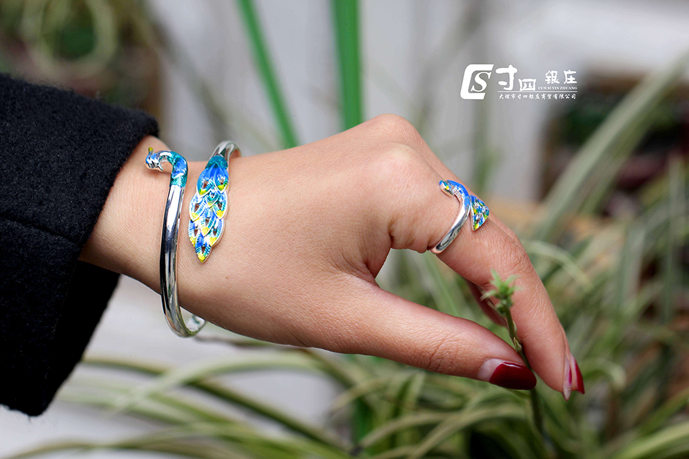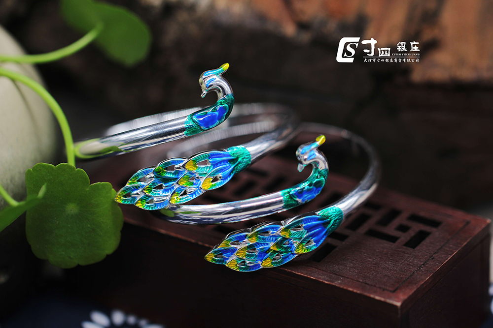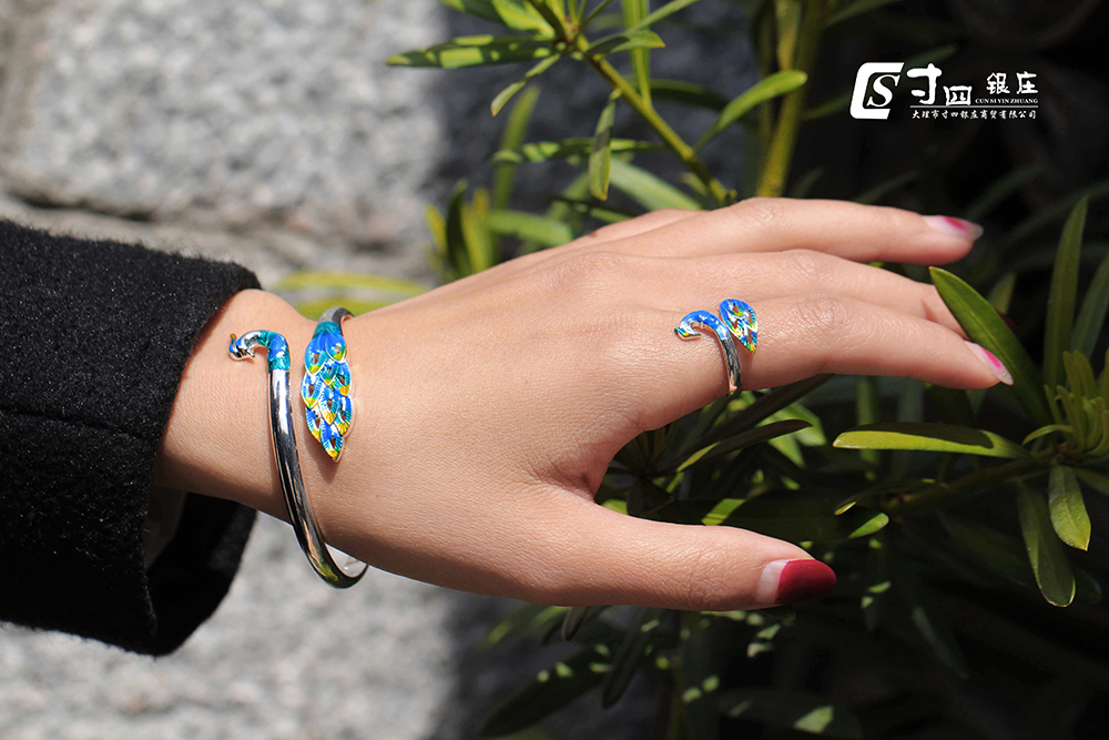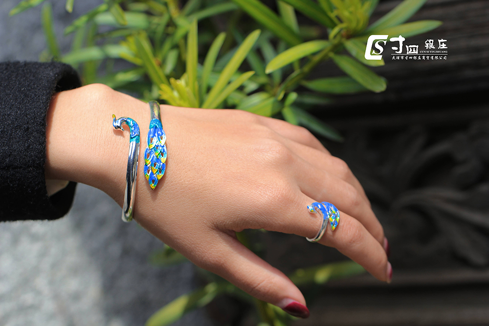 寸四銀莊景泰藍(lán)孔雀套裝,工藝精湛,雪花銀材質(zhì)。有手鐲(27克左右 21.8/克)、戒指(288元一個(gè))、吊墜(大880/個(gè)  480/個(gè))、銀鏈580/條,