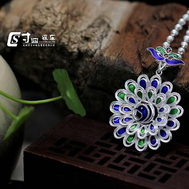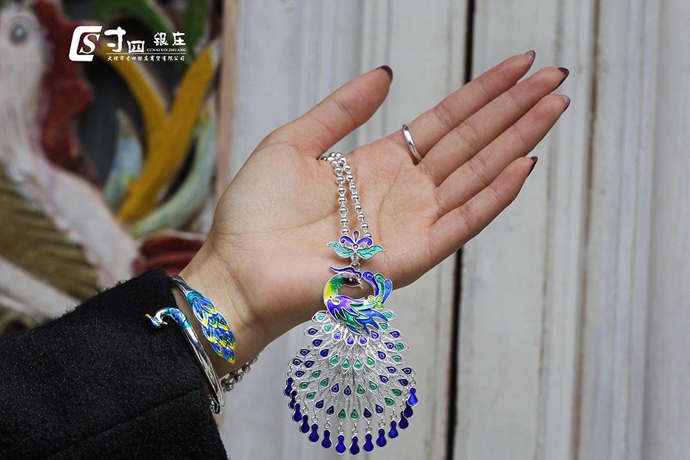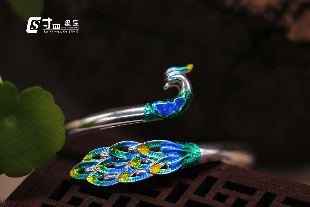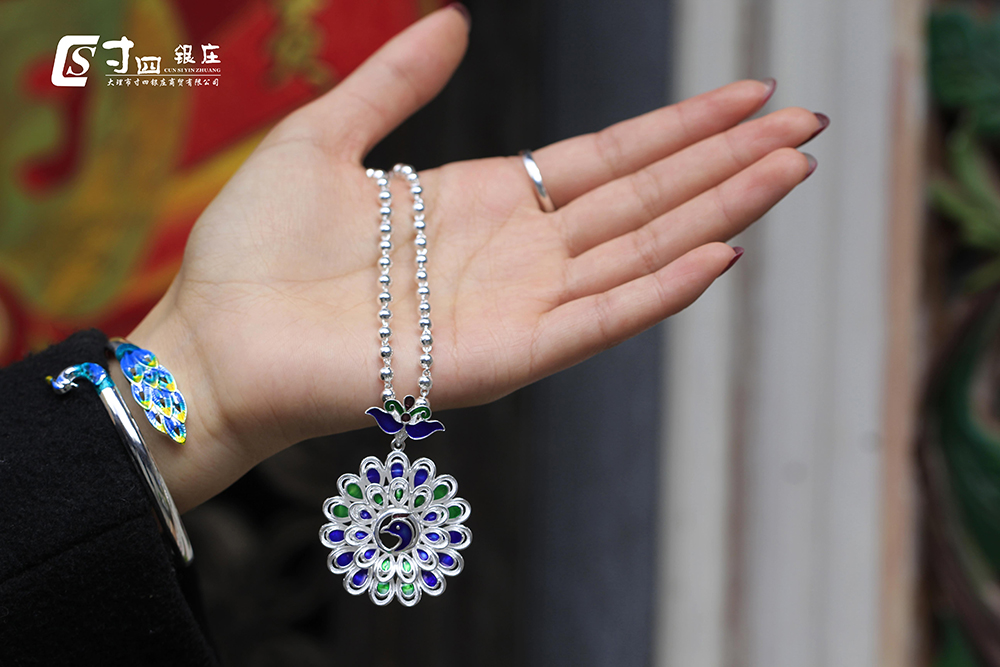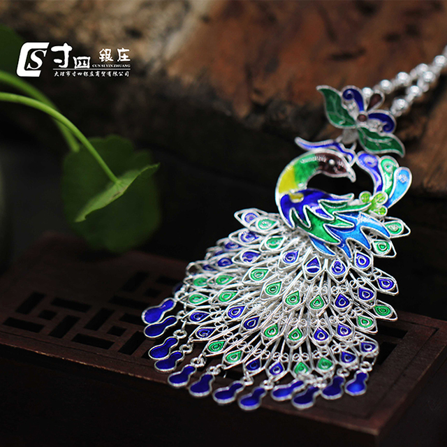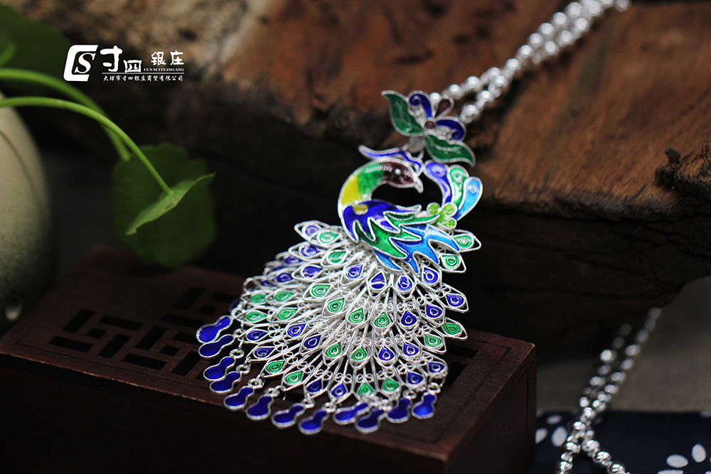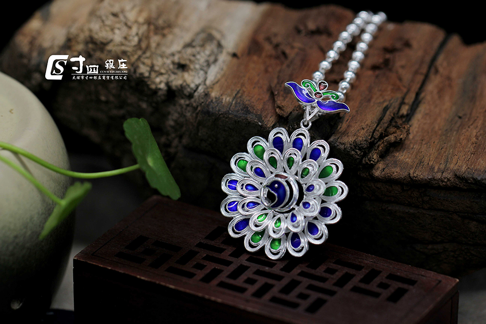 寸四銀莊景泰藍(lán)孔雀套裝,工藝精湛,雪花銀材質(zhì)。有手鐲(27克左右 21.8/克)、戒指(288元一個(gè))、吊墜(大880/個(gè)  480/個(gè))、銀鏈580/條,